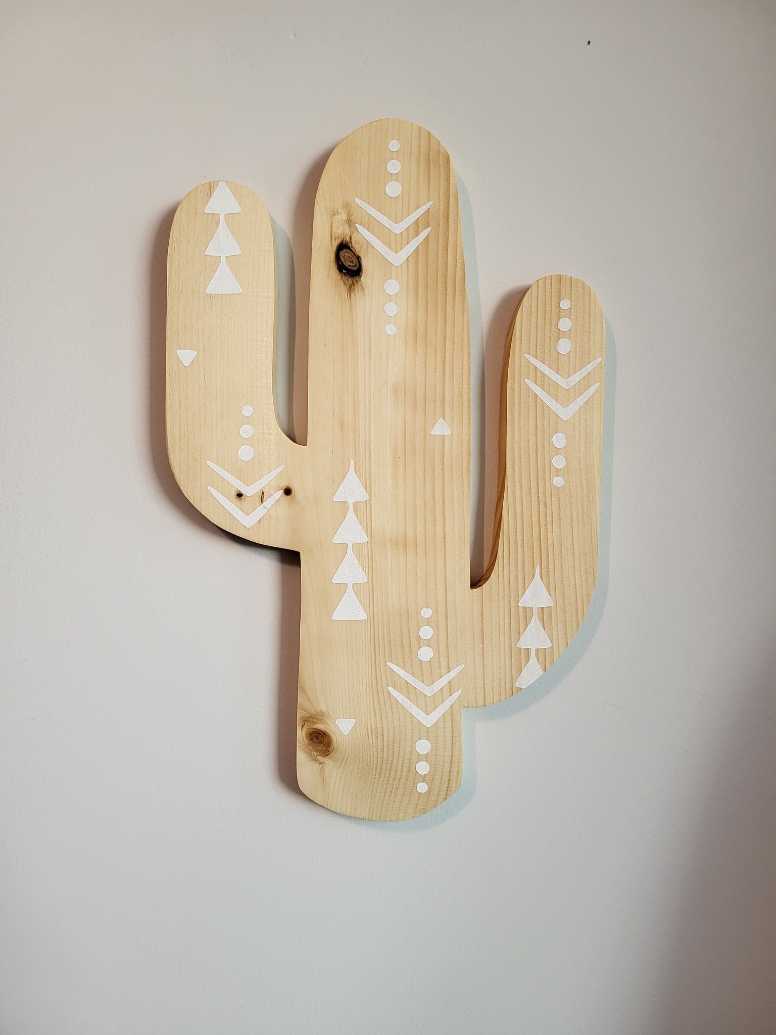 Add a touch of Southwestern charm and bohemian flair to your space with our Aztec Wood Cactus Cutout , featuring an intricate Aztec-inspired painted design. Handcrafted from high-quality Knotty Pine wood, this stylish decor piece blends modern aesthetics with rustic vibes, perfect for creating a cozy, desert-inspired atmosphere in any room.