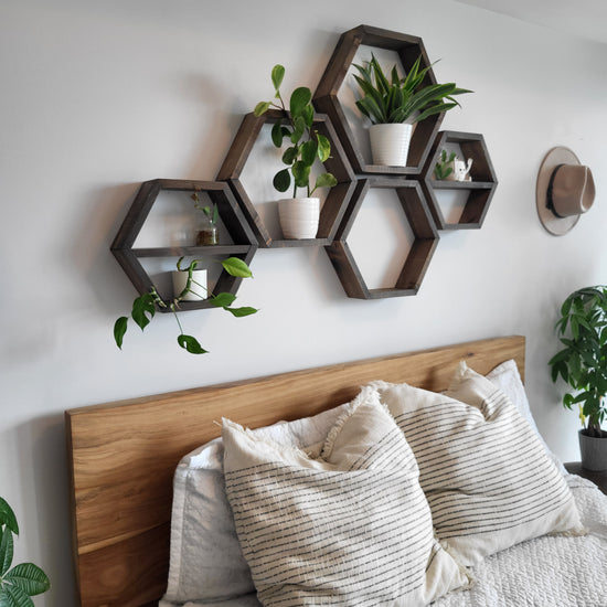 Elevate your wall art and green thumb skills with our Set of 5 Multi Size Wood Hexagons. This hexagonal set comes with Hexagons in various sizes to suit all your treasures, whether they're petite succulents or towering plants. Add some personality and practicality to your home by arranging them however you please!